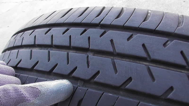 画像にあるタイヤの底の盛り上がった部分をスリップサインといい、溝の深さが1.6mmになるとトレッド面と同じ高さになり、法律で規制されている使用限度である事を表します